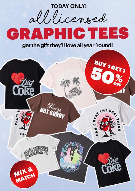 Today only! Shop in store and get all licensed graphic tees for buy 1, get 1 50% off.
